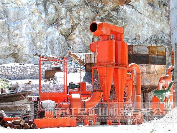 3、分級:研磨后的高嶺土粉在風(fēng)機(jī)作用下,經(jīng)選粉機(jī)分級,不合格物料還需進(jìn)入磨粉機(jī)內(nèi)繼續(xù)粉磨;